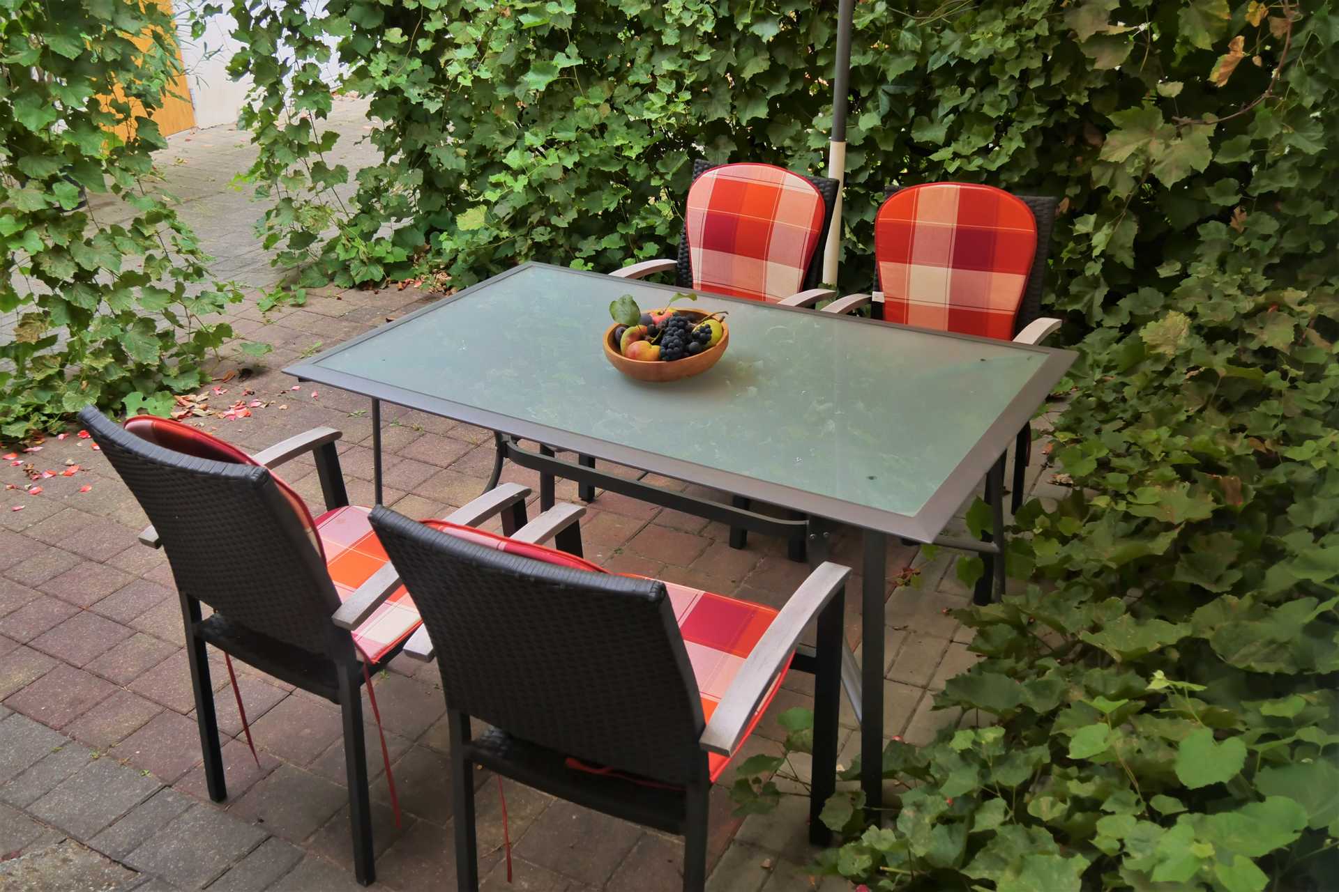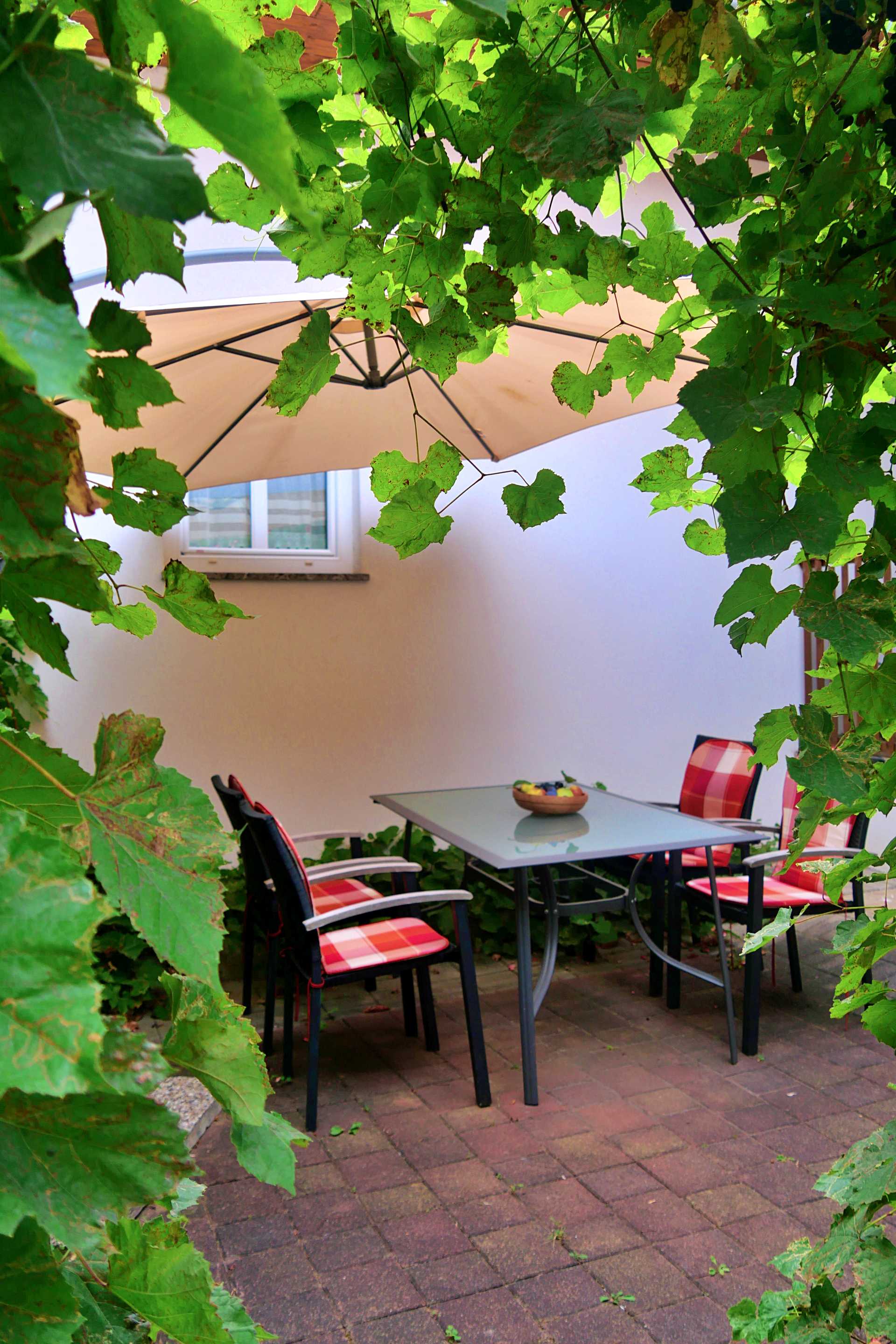 Im Innenhof ist eine Sitzecke umgeben von Weinreben. Hier kann man frühstücken oder den Abend gemütlich ausklingen lassen.