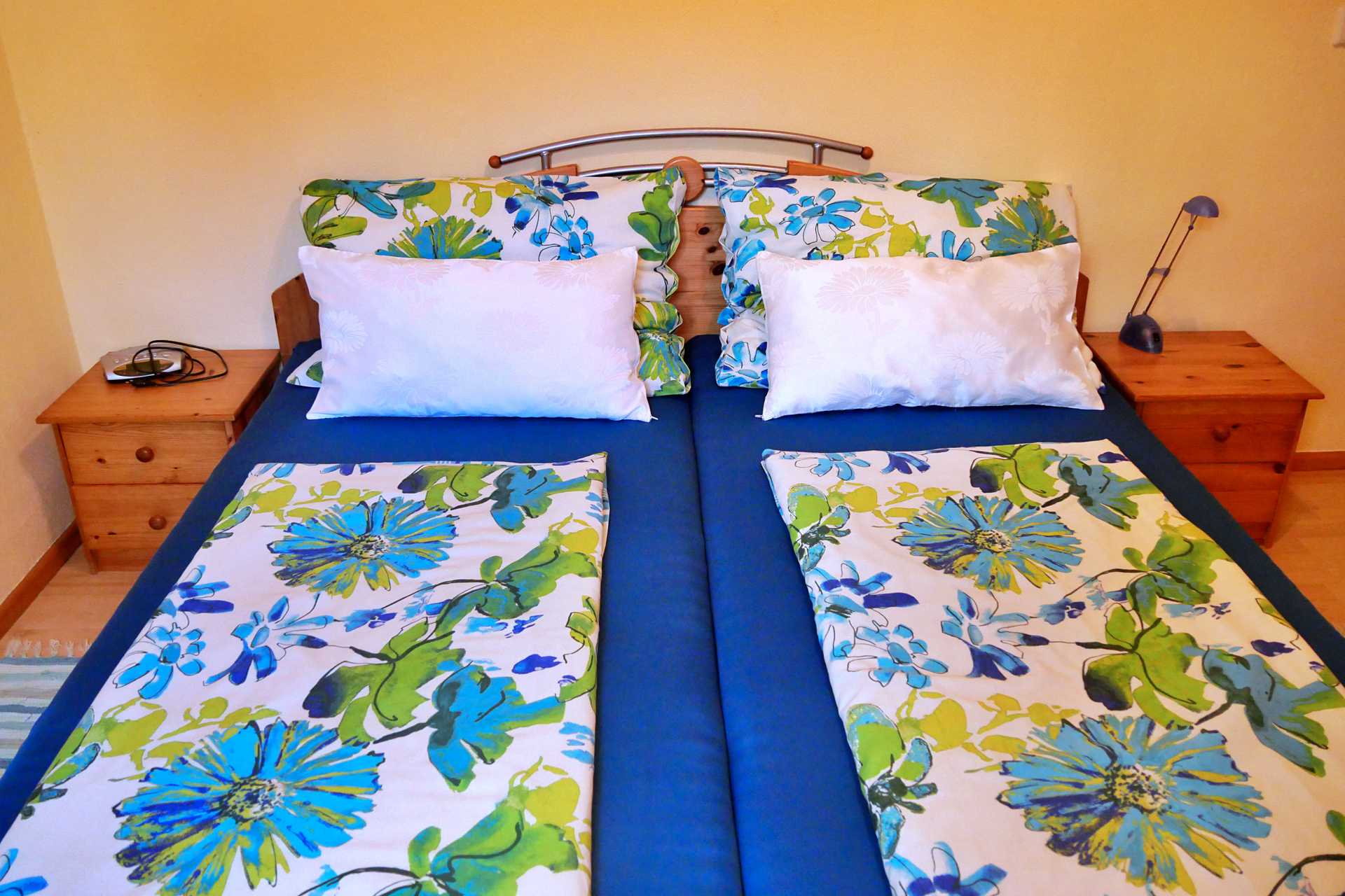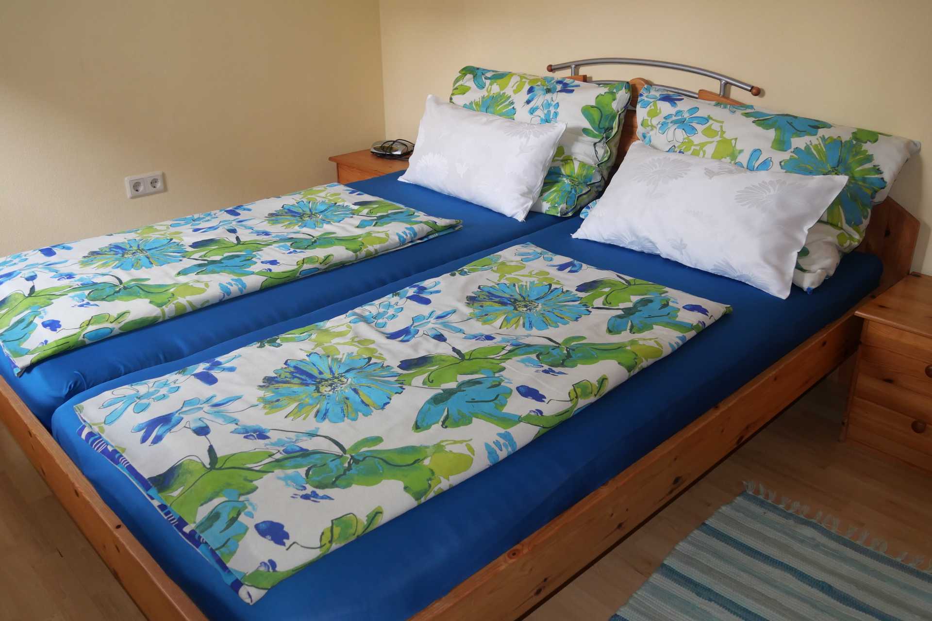 Im Schlafzimmer ist ein Doppelbett fußfrei und ein dreiteiliger Kasten. Bei Bedarf ist Platz für ein Gitterbett oder ein Zusatzbett.