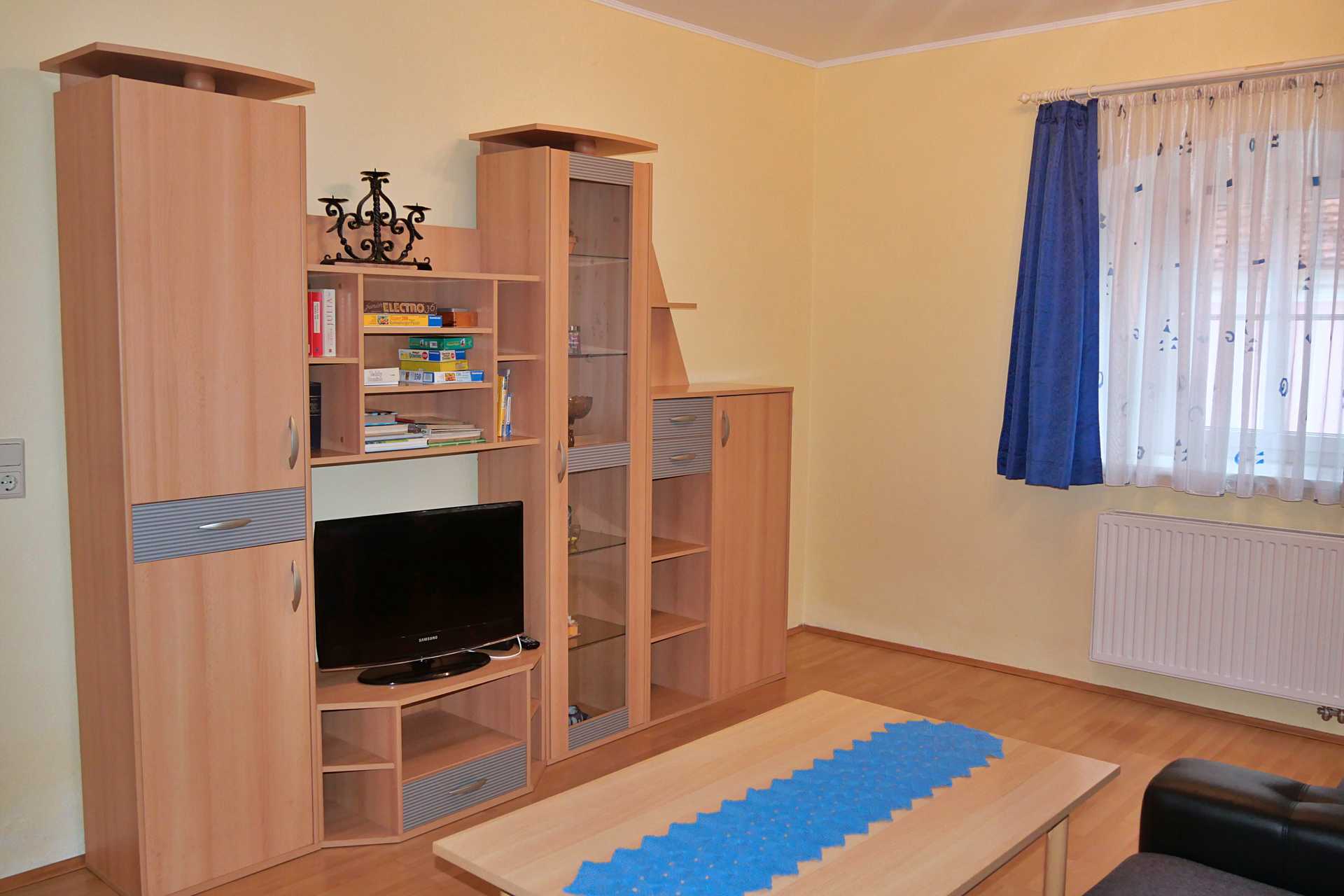 Im Wohnzimmer gibt es eine Wohnwand, SAT TV und eine Wohnlandschaft, welche mit einem Handgriff (bei Bedarf) zu einem Bett umfunktioniert werden kann.